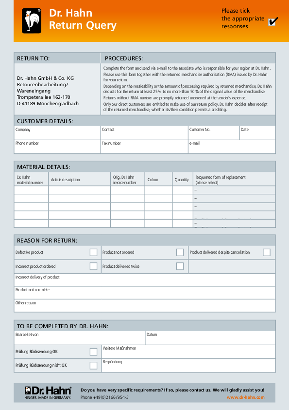 Theo nguyên tắc, chúng tôi sẽ không còn chấp nhận đổi trả bản lề. Trong những trường hợp đặc biệt có căn cứ rõ ràng, chúng tôi sẽ xem xét từ thiện — liệu có thể làm ngoại lệ hay không. Quý khách vui lòng điền sẵn mẫu yêu cầu trả hàng và gửi cho nhân viên phụ trách khu vực của quý khách tại Dr. Hahn. Nhân viên đó sẽ tham vấn Ban Quản lý Kinh doanh để xem xét khả năng chấp nhận đổi trả.